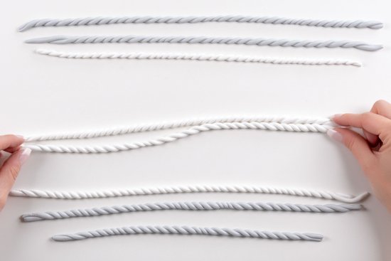 3. Ezt követően sodorjunk össze két azonos színű rudat az óramutató járásával ellenkező irányban. Így is három kötelet készítsünk színenként.